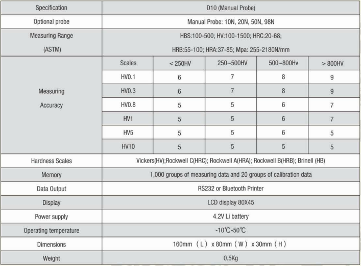 4. D10 can test hardness of ferrous metal, non ferrous metal and alloys