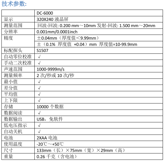2. 分辨率 0.001 mm,測(cè)量范圍:回波-回波:0.200mm-10mm,發(fā)射-回波:1.500mm-20mm